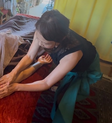 3. 【施術開始】リラックスした状態で、受ける方に横になってもらい、オイルを手に取り、体に塗布します。